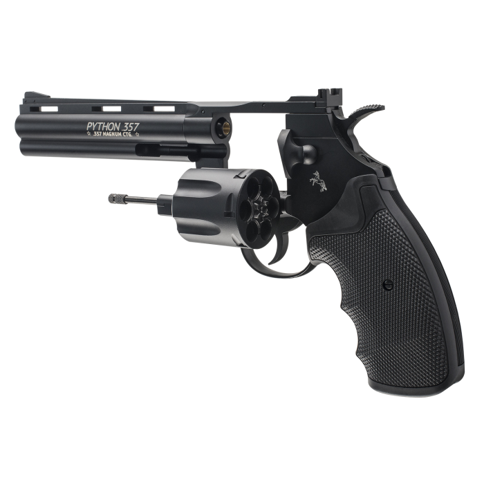 Umarex USA presents a very realistic .177 steel BB revolver-style pistol in the Colt Python! This CO2 BB revolver has a 5.5" barrel and textured grips with the Colt logo. The all-metal airgun is great to maintain firearm proficiency without the cost or inconvenience of going to a range and the high cost of expensive firearm ammo. Features include; an adjustable rear sight, manual safety, and the CO2 capsule is housed in the grip. The realism continues when its swing out cylinder is loaded with 6 removable cartridges and is easily reloaded with the included speedloader. When the cylinder is empty, push out the shells with the cartridge ejector rod. At 400 fps, the Colt Python by Umarex USA is a great plinking gun or even a great target shooting pistol! Licensed Trademarks of Colt's Manufacturing Company LLC.
